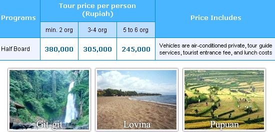 Pick up at hotel (area of Kuta, Sanur, Denpasar, Jimbaran, Nusa Dua), this tour is a trip to visit tourist objects in the northern parts of Bali. Starting with the Yellow Temple, the traditional market offers a variety of mountain agricultural products like fruits, vegetables, herbs and various others. Followed by Gitgit, the largest waterfalls and the most beautiful in the island of the Gods. Later moved to the city of Singaraja, the old town which has become the provincial capital and full of historical value, where the city has an old port as the gateway entrance invantri Majapahit troops, the merchants of China, and Dutch colonizers in the past. Then continue with a visit to Lovina Beach, the beach lovely nan with black sand that sparkled the famous Lumba-lumbanya animals often danced in the morning the sea surface. Lunch is served at the restaurant in Lovina Aditya. After lunch the tour continued with visits to Banjar, a Buddhist temple with the magnificent architecture of collaboration between Bali and Southeast Asia. Then enjoy the beautiful expanse of rice paddies that berundak Pupuan steps on the way back to the hotel. Tour is over.