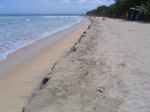 Kuta Beach in recent years experienced severe enough erosion. Images on the left side shows the water slowly but surely showing the “power” and urged more water to the mainland. Business is already done to prevent the water continued to rush, like the accumulation of sand that involves a lot of heavy equipment vehicles, as seen several months earlier. But it was not enough, in fact there are some areas of Kuta beach “lost” coast to 15 meters in 200 meters distance.